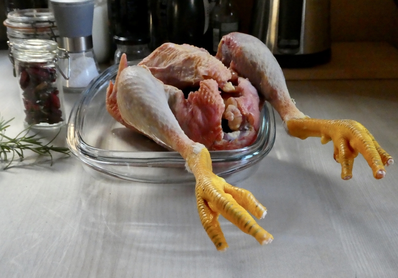 Uns ist ein Tier zugelaufen. :D Innereien, Hals und Füße sind jetzt mit Suppengrün in einem Topf, der Rest ist mit Rosmarin- und Thymianzweigen gefüllt in den Ofen gewandert. Ich bin sehr gespannt ...