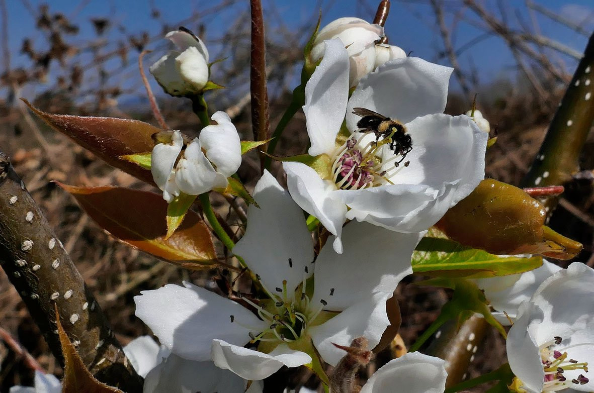 Anfangs wurden die Blüten nur von Hummeln besucht, jetzt überwiegt zahlenmäßig eine pummelige Biene mit pelzigem rostroten Hinterteil. Sie ist ausgesprochen hektisch unterwegs, sodass mir bisher kein brauchbares Foto gelungen ist.