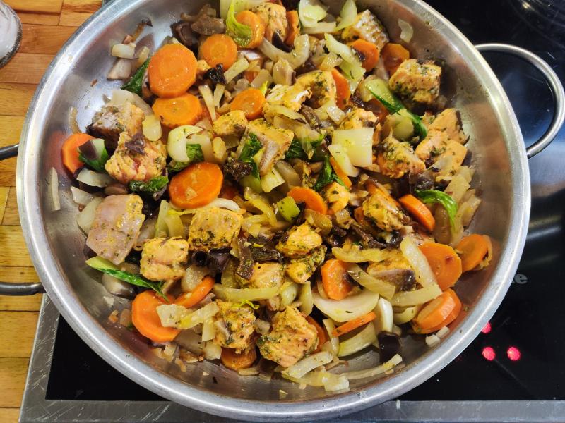 Heute gab es Saiblingsragout mit gut gewürztem gedünsteten Reis.