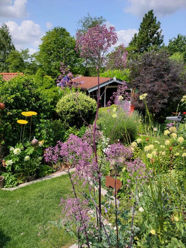 Endlich Thalictrum. Wollte erst 2.50 m hoch werden. Daneben die Bienenspielwiese, Cephalaria.