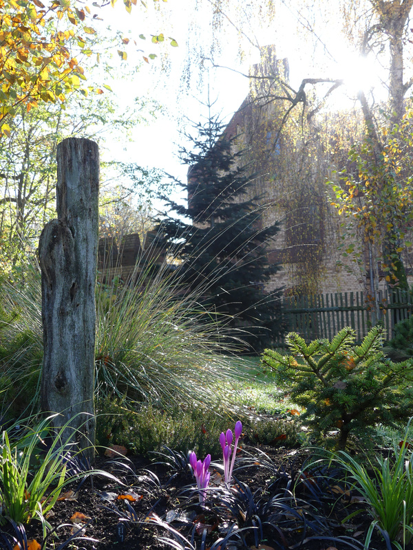 @Hausgeist: Die purpurfarbenen Colchicum-Blüten zwischen dem schwarzen Schlangenbart funkeln wie kostbare Edelsteine, einfach toll!