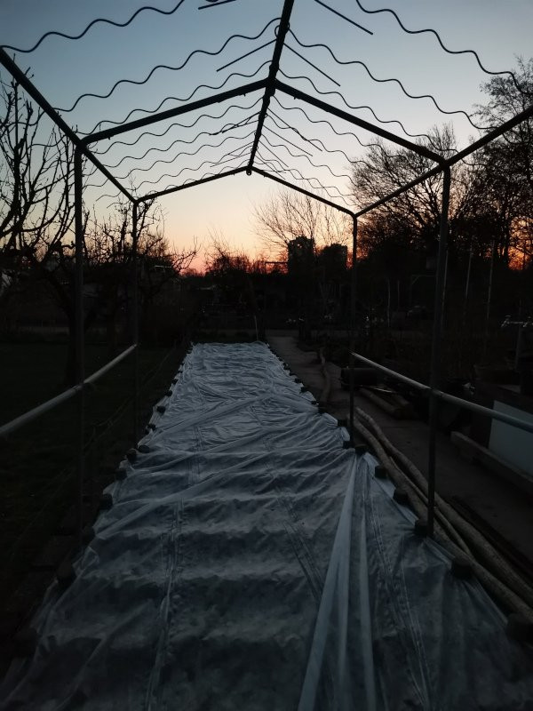 Hier sind jetzt die Tage, wo sich das abdecken vom gepflanzten Gemüse mit Vlies noch lohnt. Nachts klarer Himmel, das kühlt schon aus.