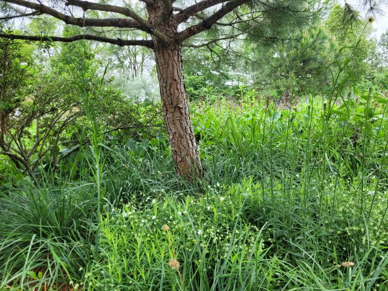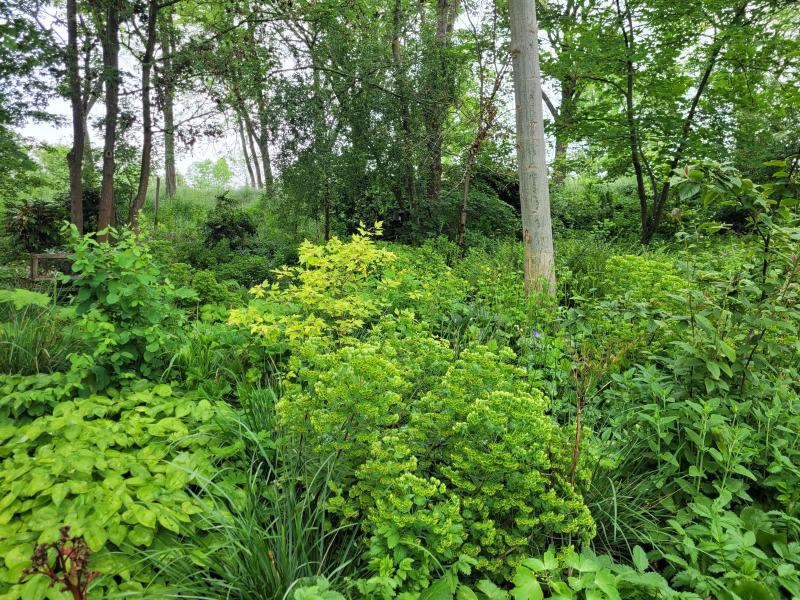 Der dunkle Waldbereich wird effektvoll durch gelbe und weiße Gehölze und Stauden aufgehellt. Toll ist die Wirkung der zahlreichen Alliumbälle, die überall verstreut hier aufblitzen. :D