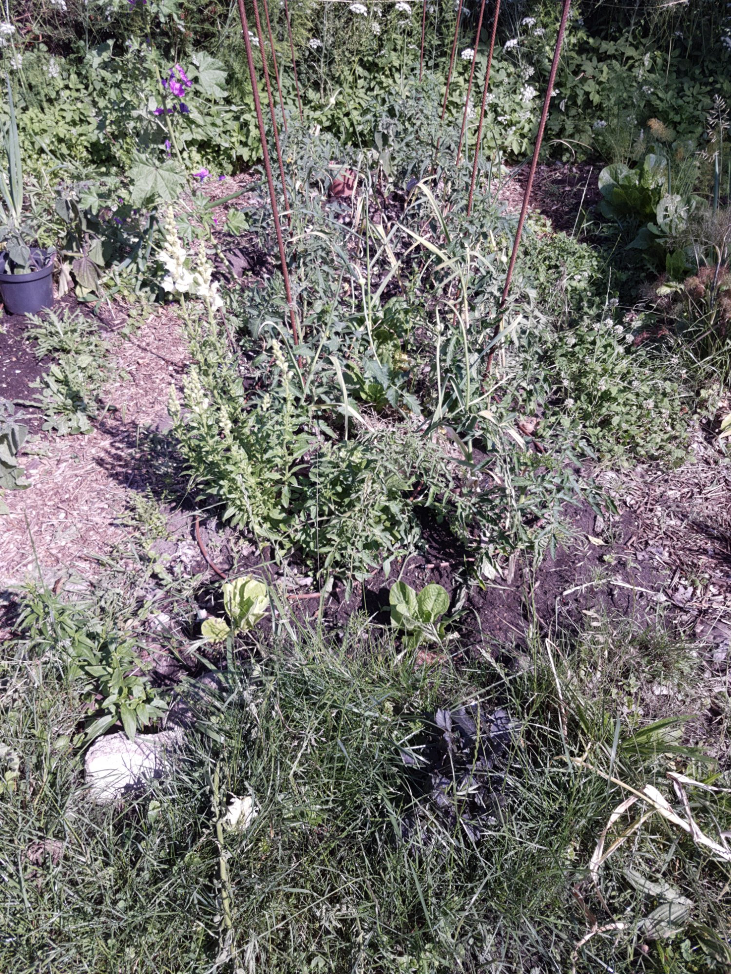 Freilandtomatenbeet mit verbliebenem Knoblauch. Den hatte ich im Oktober schon gesteckt. Jetzt arg vom Rost befallen, ein Teil wurde schon geerntet, der Rest folgt wohl in Kürze.