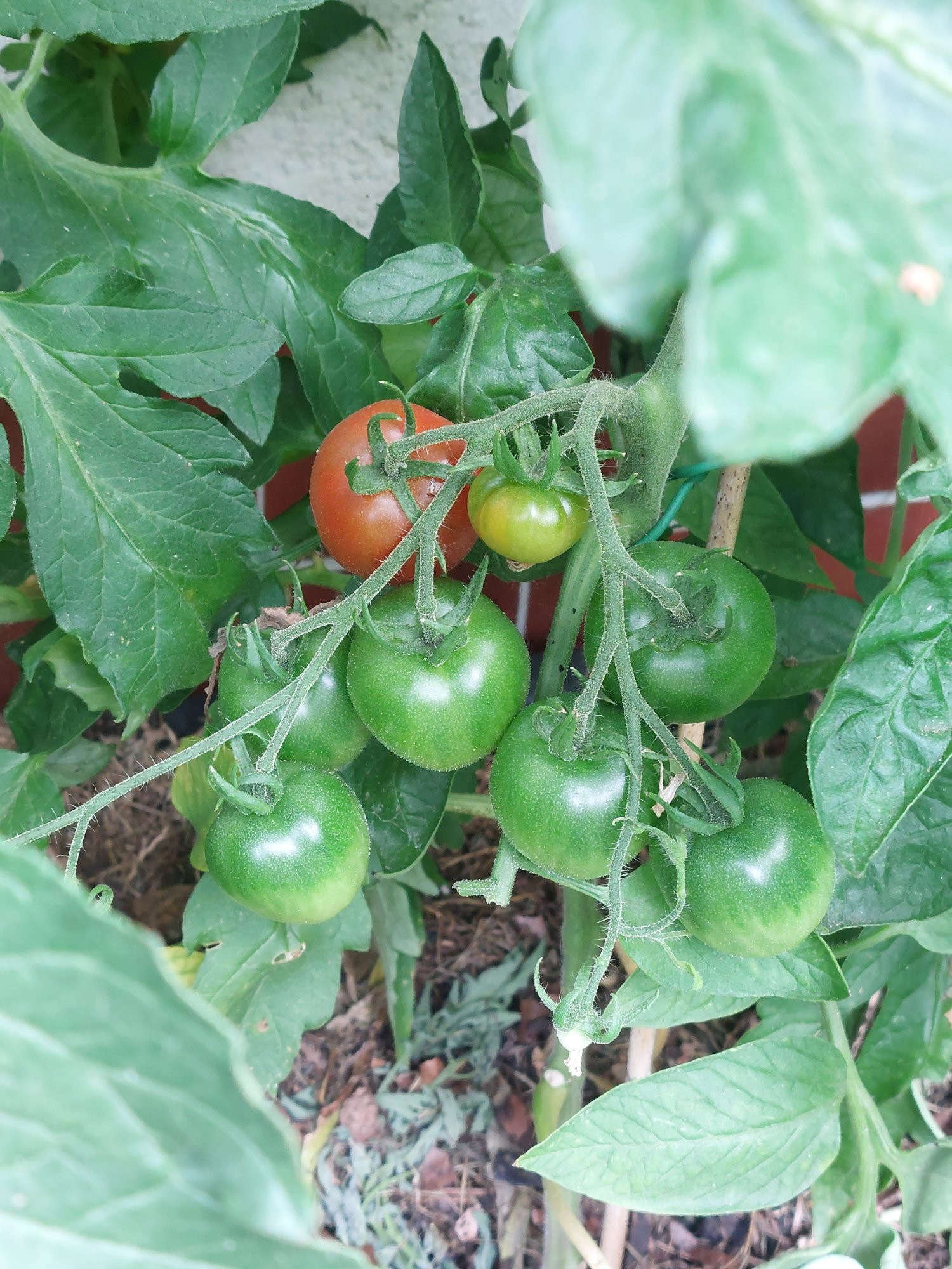 Das Beet hatte ich nur mit Kalkstickstoff gedüngt und ich hatte den Eindruck, dass die Tomaten erst nicht recht vom Fleck wollten. Vielleicht waren die 10 Tage bis zur Pflanzung zu kurz. Nochmal mit Hühmermistjauche nachgedüngt + KAS. Jetzt wachsen sie, 2. Blütenrispe kommt.