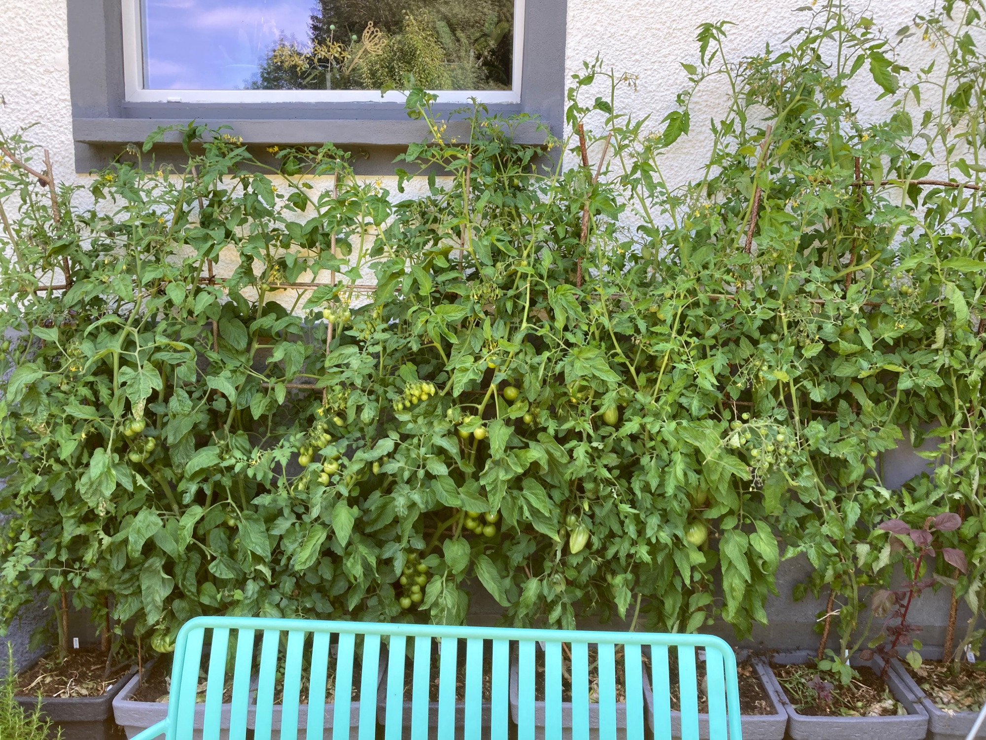 Der Tomatengarten (Schirme pink, hellblau) sieht oberflächlich noch recht gut aus.
