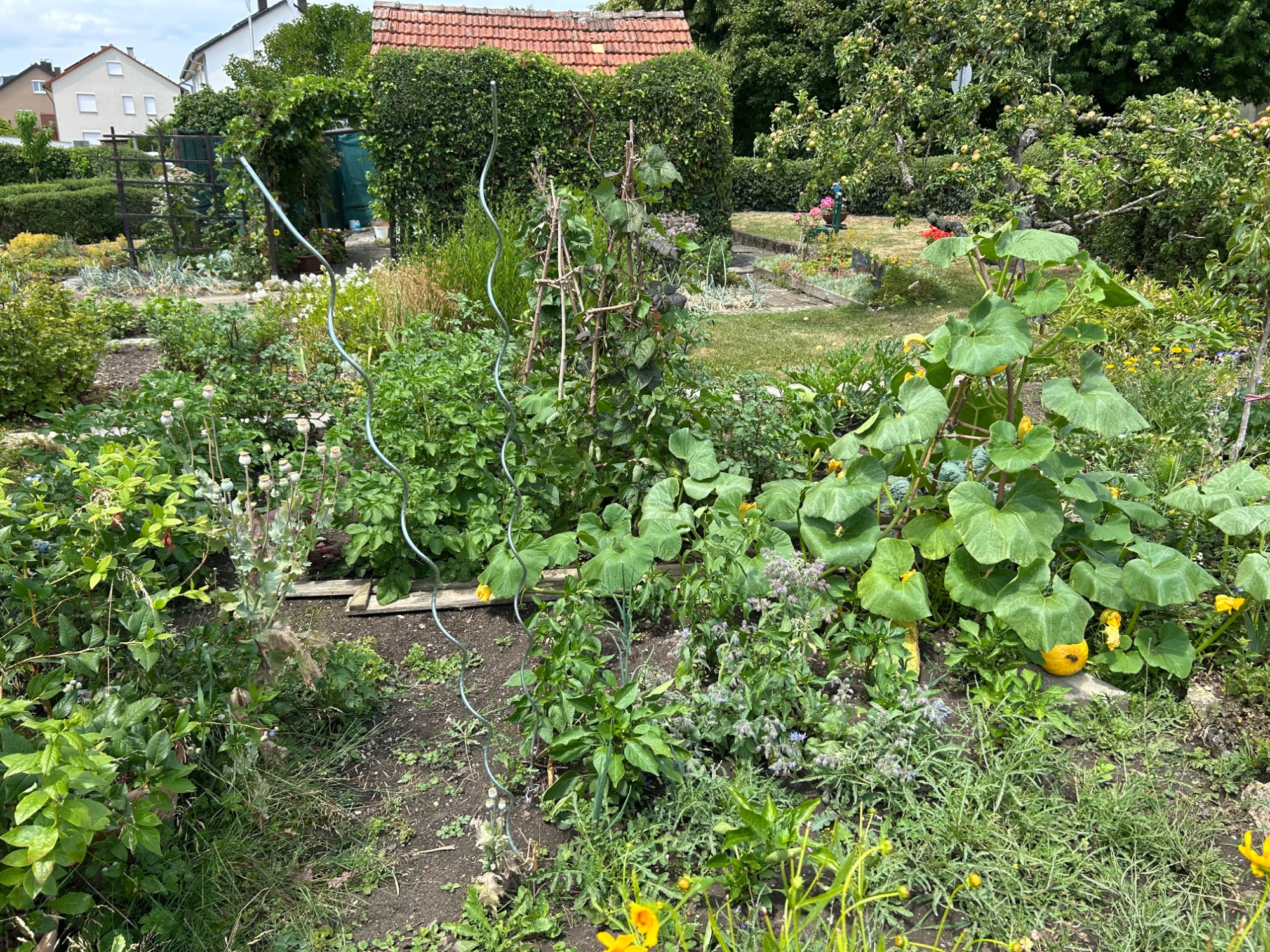 Bei mir fühlt sich der Kürbis gerade zu wohl und wächst überall hin. Die Stangenbohnen, Wirsing, Zucchini, Kartoffeln und Paprika haben alle Besuch vom kontaktfreudigen Kürbis. Die Reihe der roten Gartenmelde hat dem Feldhasen sehr gut geschmeckt, soll er ruhig! Ich habe jetzt Cime di Rapa gesät mal sehen, obs noch was wird. Vorne der Ruccola, den ich vor 3 Jahren gesät habe und der sich seither überall selbst aussät. Da ich ihn liebe, freut es mich. Vorne links die Blaubeeren.