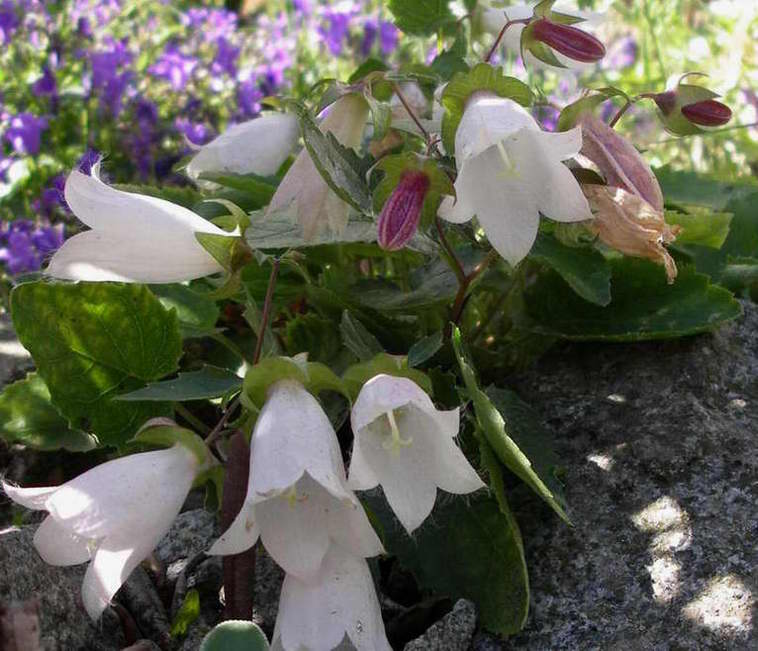 Campanula betulifolia zeigt ihre großen Glocken. Noch schöner sind fast die roten Knospen.