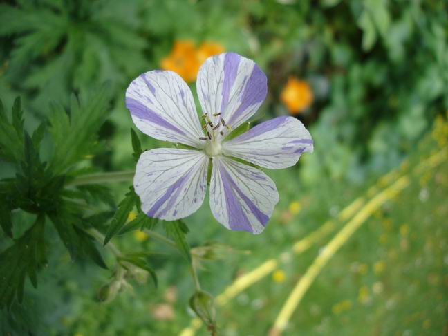 Ich bin ganz happy: vor drei Jahren pflanzte ich ein Geranium "Splish-Splash", das zwar ein paar labberig bläuliche Blüten zeigte, mit dem einen oder anderen dünnen blauen Streifen, ansonsten aber eigentlich nur durch seine extreme Kippelig- und Staksigkeit auffiel. Diese Pflanze hat sich in die benachbarten Funkien Stiletto und in die Brunneras hinein ausgesät. Eigentlich wollte ich sie schon im vorigen Herbst rausreißen, habs aber nicht geschafft, und nun blühen diese Sämlinge viel schöner als die Mutterpflanze und sind vor allem standfester, weil sie sich so unverschämt von den anderen Pflanzen halten lassen.