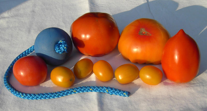 meine Ernte vom Sonntag - von links nach rechts :Eva's Purple BallAdams Spielball Durchmesser 75mm zum GrössenvergleichAdamovo Jabloko 420g - ist errötet nachdem ich mich im Forum über ihn beklagt habeHillbilly 410g - leider abgebrochen, vielleicht noch nicht fertig reifAmish Pasta 225guntere Reihe Amish Goldund die Amish Cherry, die verschwinden immer gleich beim Pflücken - seltsam.Nun gibt es doch bei uns auch noch ein paar reife TomatenGrüsseEvelyne