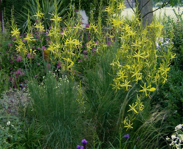 Asphodeline liburnica im heißen Steppenbeet. Ein echter Feierabendblüher - abends pünktlich um fünf gehen die Blütensterne auf und am nächsten Morgen ist alles vorbei. So geht das den ganzen Sommer....