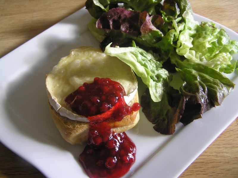 camembert im brötchen (oder besser auf - hat nicht ins brötchen gepasst) aus dem ofen. mit preiselbeeren und salat.