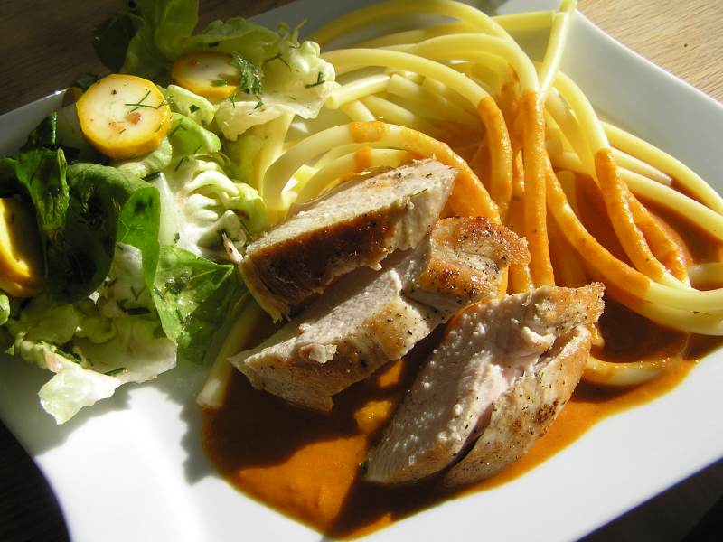 bei uns gabs heute maishähnchenbrust mit paprikasoße, maccaroni und gartensalat mit vielen kräutern und zucchini