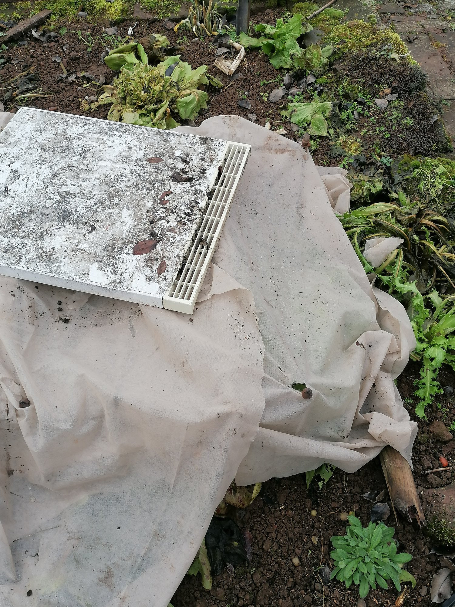 Draussen und Ungeschützt ist fast alles stark geschädigt, wo nur bisschen Vlies drüber lag, gleich besser. Auch 2 Pflanzen zwischen Frühbeet und Buchshecke sind noch einigermaßen grün.