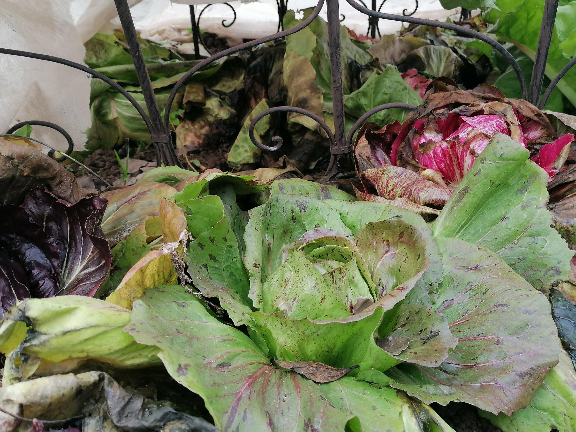 Heißt aber für den Erkenntnisgewinn (da das Vlies ja sicherlich erst kam, als die ganz kalten Nächte auf dem Plan standen und von daher hier kein Vergleichsfeld mit Trocken- & Feuchtetemperatur wie bei den Endivien im Frühbeetkasten - sofern er auch vor den kalten Nächten schon immer meistens geschlossen war): Die Tendenz, gut entwickelter Radicchio macht -10 entspannter mit als Endivie verdichtet sich.