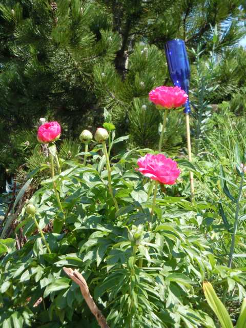 Der einzige Fauxpas auf dem Bild ist eigentlich nur die blaue Flasche. Eine schrill pinkfarben blühende Pfingstrose in einem ansonsten sehr ruhigen, uni grünen Umfeld geht doch völlig in Ordnung.