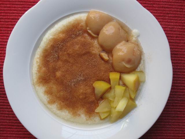 Gute Besserung Kolibri!Viel Spaß beim Käsefondue Luna! Hast Du an der Suppe Senfkörner dran oder gemahlenen Senf?Hier gab es kurzerhand Grießbrei mit Zucker&Zimt. Dazu gekochte Apfelstücke und für mich noch etwas Pfirsichkompott (die hiesigen Pfirsiche sind ziemlich herb und bei Kindern nicht beliebt - macht nix, bleibt mehr für mich :D ).