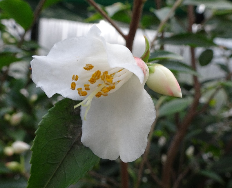 Bei Camellia cuspidata kann der Neuaustrieb anscheinend behaart sein, die Haare gehen aber im Verlauf des Jahres verloren. Das würde dann passen.