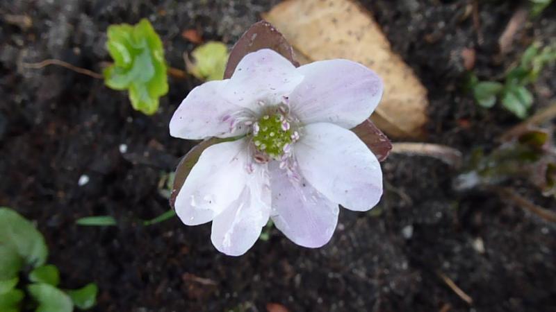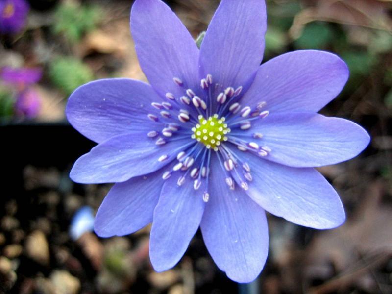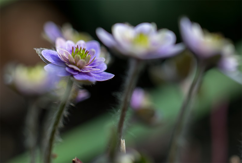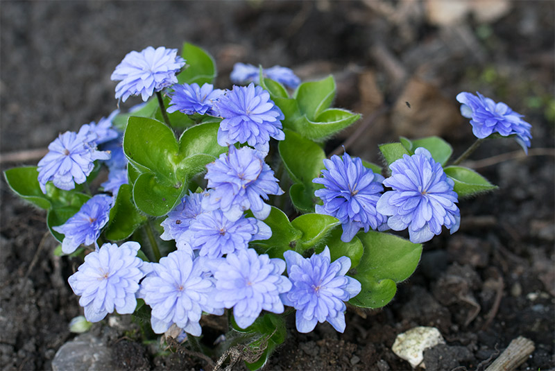 Hepatica nobilis (Farbunterschied) zwei Pflanzen im Beet.