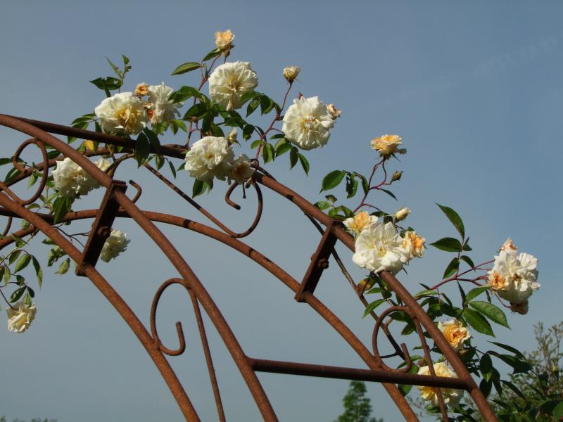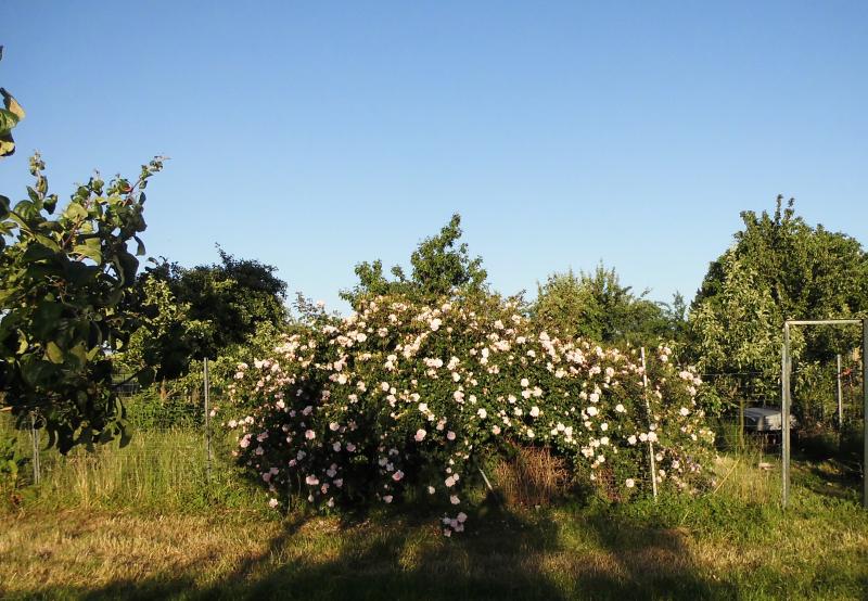 Die R.arvensis haben wir mit einem Rosenhalbbogen an die Kiefer geführt, dient heute noch als Durchgang und zusätzlich einer Cl. Huldine als Kletterhilfe. Den Rest hat sie selbst hinbekommen.