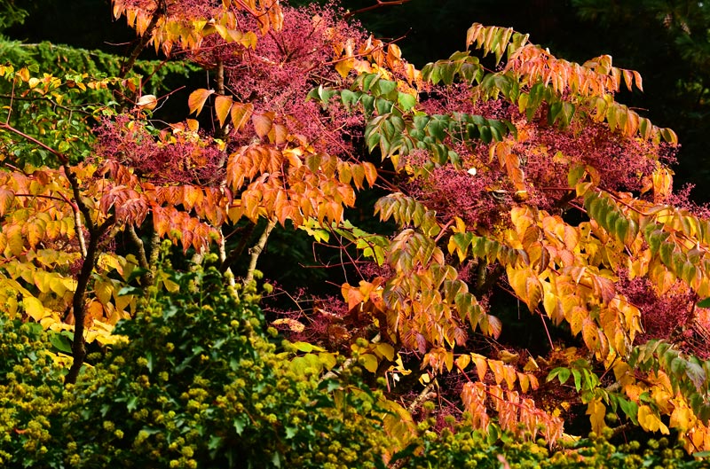 Der Losbaum wirkt im Oktober durch die bunte Fruchtphase sehr frühlingshaft, während die Schindeleiche im Hintergrund klassisch ergoldet...