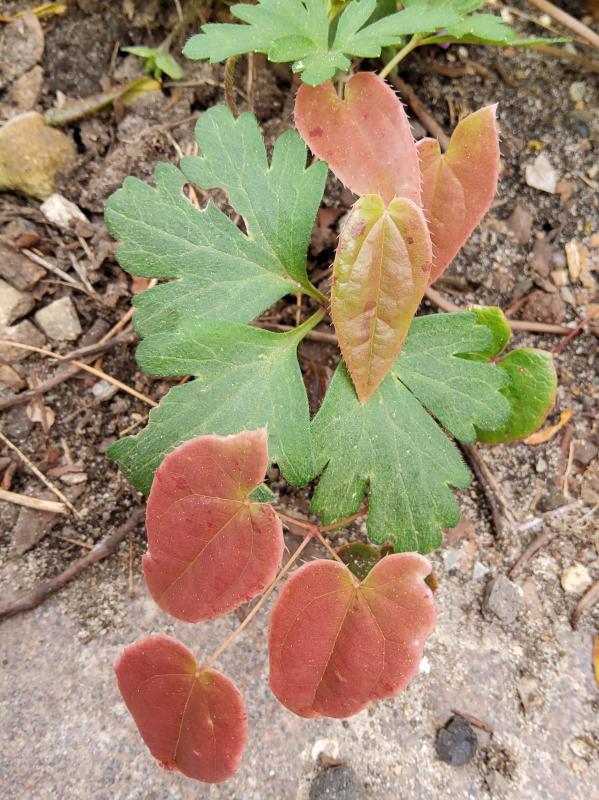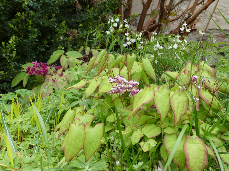 Hier stehen die Epimedium dieses Jahr ganz gut, 'Miyako' ist eins meiner liebsten. Im Hintergrund leuchtet noch 'Purple Prince'.