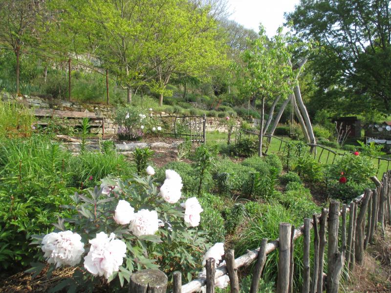Blick von dem Gartenteil, den ich kleine Macchia nenne, über die Kräutermauer zur Schaukel.