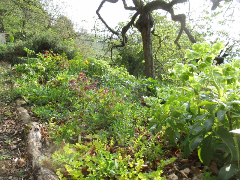 Die Pflanzung um "Bellevue" mit Anemone sylvestris, Areum italicum und Corydalis lutea. Salvia tomentosa uns Aqulegia vulgaris haben sich eingeschlichen.