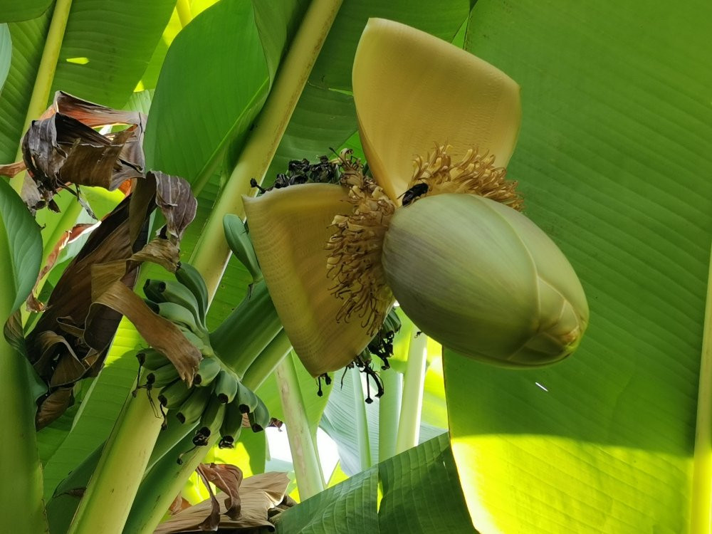 Es ist mir jetzt schon ein paar mal aufgefallen, wenn die Banane blüht, sieht man auffällig oft die Asiatische Hornisse. Sonst ist sie eher noch auf der Jagd, hier wird aber gezielt die Blüte angeflogen. Sammelt sie Pollen oder Nektar?