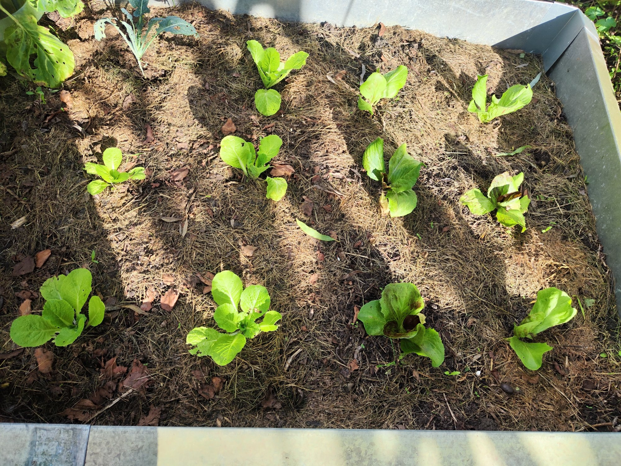 Etwas früher ausgepflanzter Radicchio legt jetzt los. Stand lange im Staub unter Vlies.