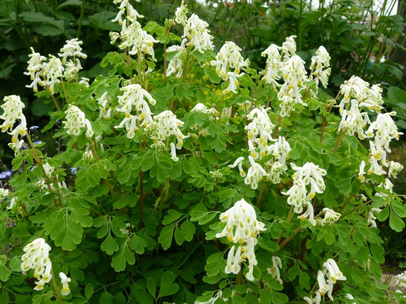 Der Weiße Lerchensporn ist zusammen mit Alchemilla mollis meine wichtigste und zuverlässigste Pflanze zur Aufhübschung der trockensten Schattenplätze, vor allem rund um die Gartenlaube.