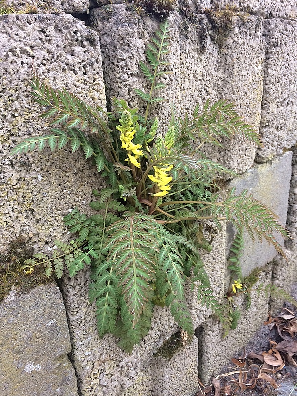 Dieser hier, Corydalis malkensis von Norna, hat den Durchbruch gebracht. Seit der im Garten steht, tauchen an der Handvoll gekaufter Pflanzen endlich Sämlinge auf. Obwohl C. malkensis selbstfruchtbar sein soll, ist es doch auffällig, dass es bis dahin keinerlei Nachwuchs gegeben hatte.