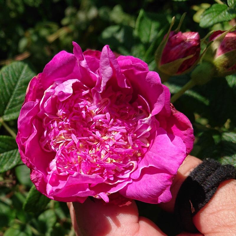 Ein Geschwistersämling zu #410 ist ´Haruga Purpurpink´ (https://www.helpmefind.com/rose/l.php?l=2.67573.0 ). Neben den großen Blüten fallen besonders die fast stachellosen Triebe auf.