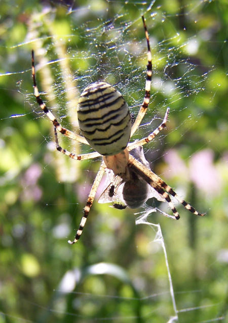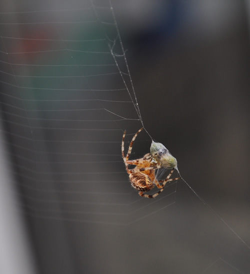 Heute erhielt eine Spinne, die quer vor einer Glastüre ein Netz gespannt hatte, von mir das Mittagessen und Abendessen spendiert.Grüne Räupchen frassen mir von Stecklingsröschen sämtliche Blätter ab. Da hänge ich sie ins Netz der Spinne. So!Die Spinne raste hin und wickelte sie im Nullkommblitz ein.