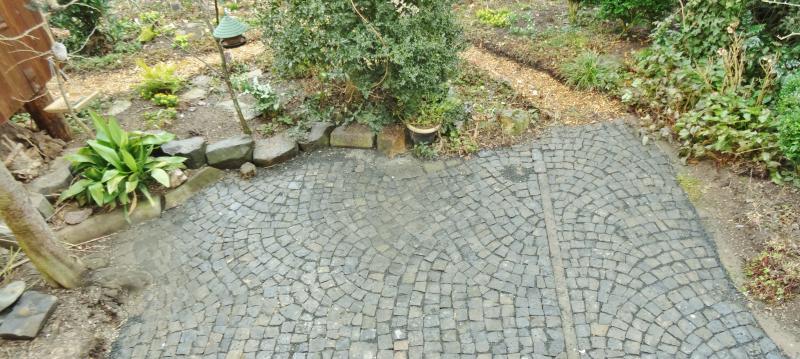 Es fehlt noch die Befestigung des Weges in Rolatorbreite der rechts zur Sitzgruppe führt.