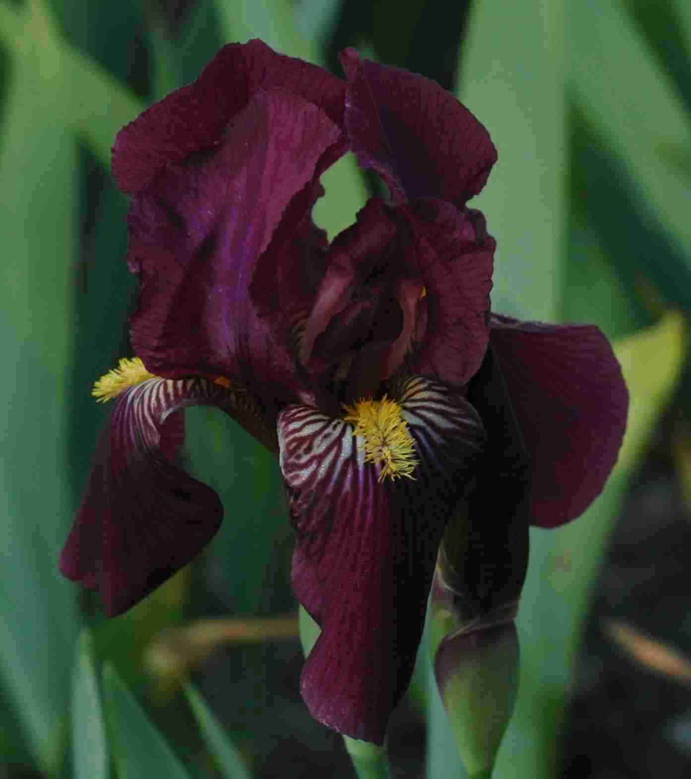 Hier ist noch eine Dunkelrote von tiger honey. Sie hat auch noch keinen Namen. Ist nicht ganz so hoch wie eine IB. So hoch wie Tumwater auch in der Blütengrösse. Die Hängeblätter falten sich immer etwas ein bei jeder Blüte. Vielleicht weiss Jemand den Namen?