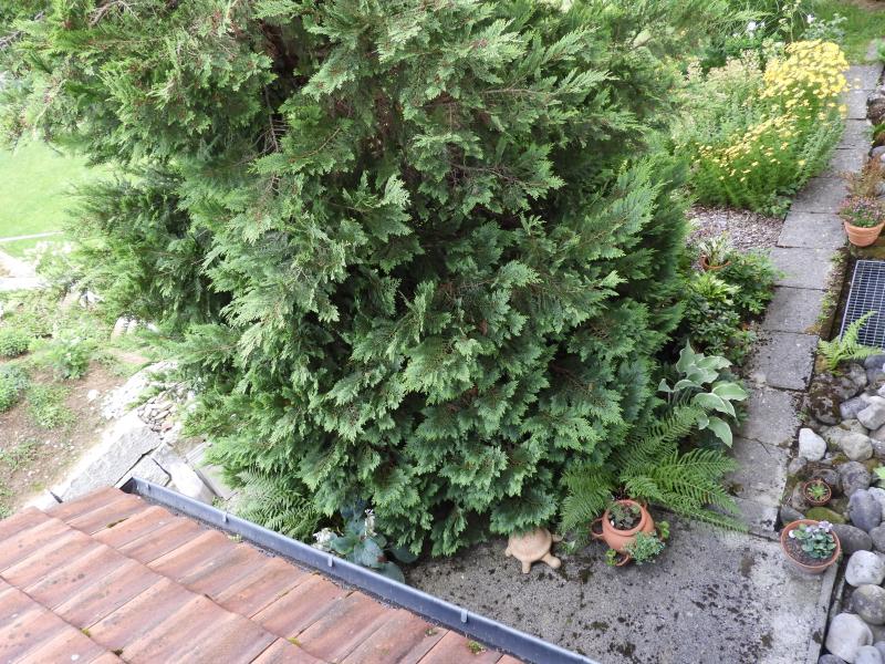 Und um beim Thema zu bleiben; Blick aus dem Fenster auf den "Ostbaum". Da ist bei uns kaum Gartenboden und Raum im Osten. Es war mal kurz die Rede von Fällen, denn irgendwann wird er wohl zu gross. Aber nicht, solange ich hier wohne.