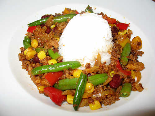 Wir waren am Wochenende unterwegs in Erfurt (sehr nette Stadt, gefällt mir richtig gut) und haben nichts eingekauft zum essen. Deswegen gab es heute, was der Kühl- bzw. TK-Schrank so her gab. Zuerst einen Salat aus ein wenig Eisberg, Chicoree ud Spitzkohl mit Avocado und Körnersenf. Danach Veggie-Hack mit mit einer Gemüsemischung und Basmatireis. Ging schnell und war lecker.