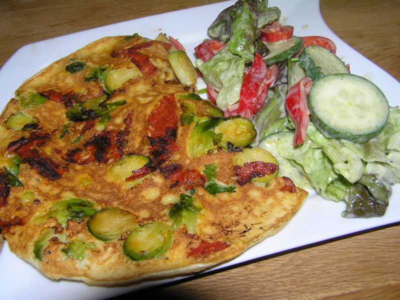 was ist da drin? kartoffeln, speck...und was ist das grüne?das ganze dann in strudelteig gewickelt und gebacken?!bei uns gabs pfannkuchen mit speck und rosenkohl. dazu roter kopfsalat mit gurke und paprika.