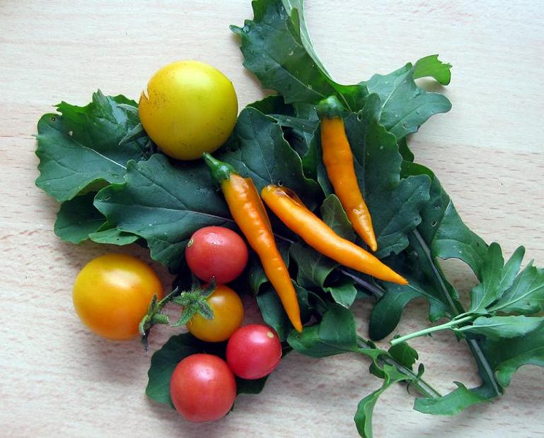 Pflücksalat, ein paar Blätter geschossener Ruccola, 3 Pendulinas, 3 Gartenperlchen und 3 Chili Criolla Sella