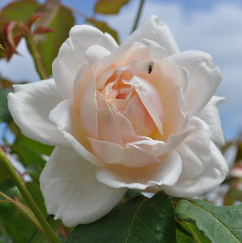 Mme Alfred Carrière sollte eigentlich von vorne beginnen, da sie schon Knospen hatte, blüht sie nun, aber es ist ihr deutlich anzusehen, dass sie Frostschäden hat.
