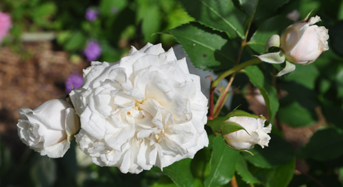 Rosa Cannabifolia, drei Blütchen, gerade noch erwischt, das ist die einzig ohne Schaden! Carabea huhu! Sie hat sich einigermassen vom Mäusebiss erholt, wenn auch noch kein junges Holz hervorkommt.