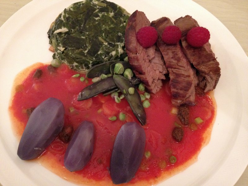 es gab pferdefilet auf einer tomatenessenz mit morcheln und frischer zwiebel (tropea), dazu blaue st. galler kartoffeln aus dem dampf, ein gestürztes dauerspinatgratin und leider völlig missratene, sowieso zu alte blaue zuckerschoten...