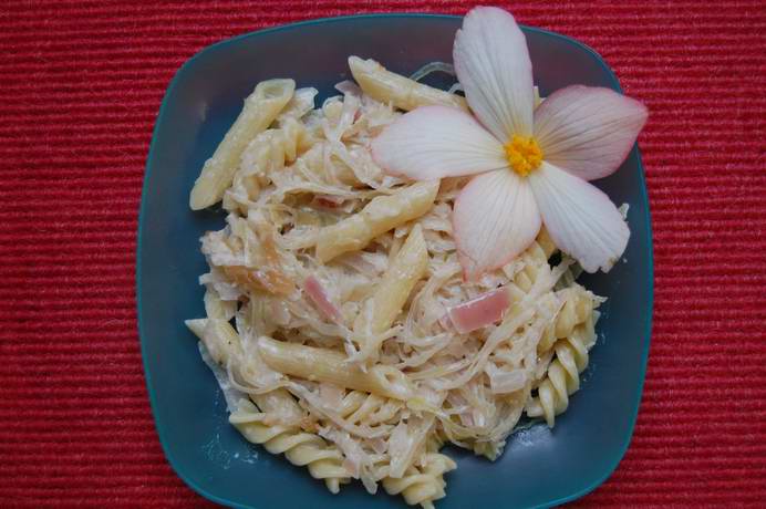 Das klingt alles lecker, Aella. Und sieht auch noch so gut aus :) .Hier gab es heute Sauerkrautnudeln. Damit wäre mein Sauerkohl erst mal alle. Gute 800 g reichten für drei verschiedene Gerichte (Sonntags gab es Lieschens Kartoffel-Sauerkohl-Empfehlung), das waren insgesamt reichliche 11 Portionen - hätte ich nicht gedacht.