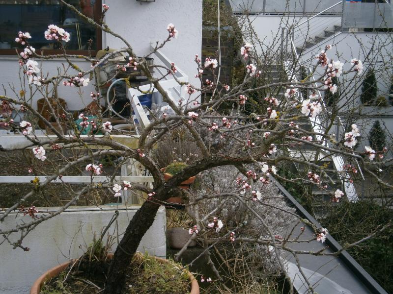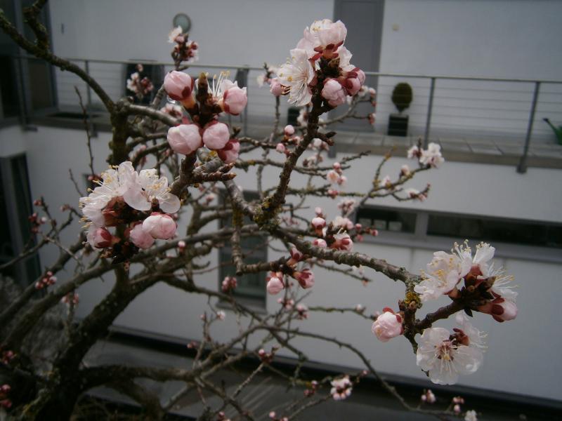 Mein Aprikosenbaum, ca 30 Jahre alt, aus einem Kern einer Bergaprikose (evtl türkisch)in einem Kübel gezogen, hat durch den kurzen Frost im Januar sehr gelitten. Obwohl die Knospen noch klein waren, sind 90% der Blüten erfroren. Der milde Winter hat ausgereicht. Die Ernte wird wohl überschaubar. Letztes Jahr war die Ernte auch schon mager. Eine Blüte ist aufgegangen.Das Bild stammt aus einem früheren Jahr.