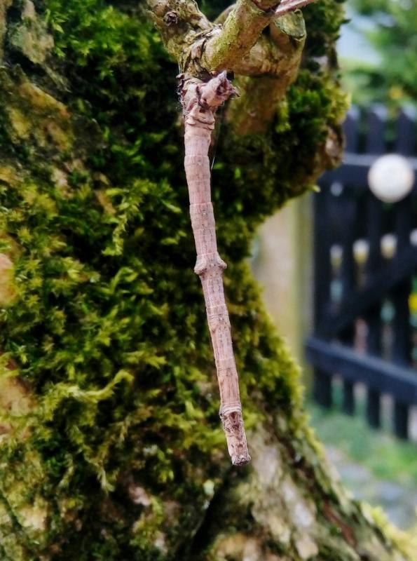 Hallo. Ich habe am Holunder herumgezuppelt und fande dann diese Raupe, getarnt als vertrockneter Ast. 4 cm lang.