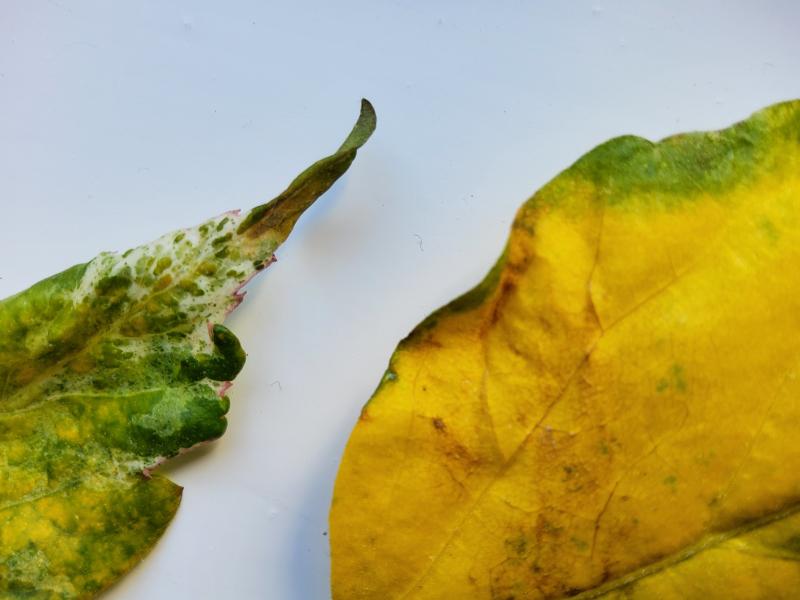 Eine der Sämlingsschwestern zeigt jetzt auch fleckige Blätter, sieht aber anders aus. Unregelmäßige heller werdende Flecken mit verwaschener Abgrenzung einerseits, und kleinere, scharf abgegrenzte Flecken neben den Adern auf anderen Blättern. Ich schaffe es nicht, das zu fotografieren... hrmpf. Mal schauen. Sie steht jetzt abgesondert. Leider habe ich nicht genug helle Plätze, um alle getrennt in Quarantäne zu stellen.