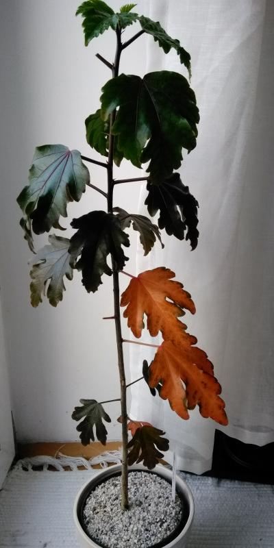 solche orange "herbstfärbung" hatte ich hier auch an jungen sämlingen, deren laub zuvor direkt am fenster und auf der heizung geradezu schokofarben wirkte. momentan (in ihrem zweiten jahr nach der keimung) sind die alle nur grünlaubig, ich habe sie irgendwann etwas weiter ins zimmer hinein gestellt.