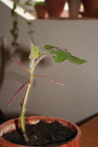 Den Lulo (Solanum quitoense) habe ich gerade hier im Forum von aurora ertauscht und war /bin ganz angetan von den imposanten Laubblättern dieser Pflanze. Ein Exemplar hatte ich auf die Flurfensterbank gestellt, wohl genau in Schnauzenhöhe unserer Dina. Das muss wohl zu verlockend gewesen ein.