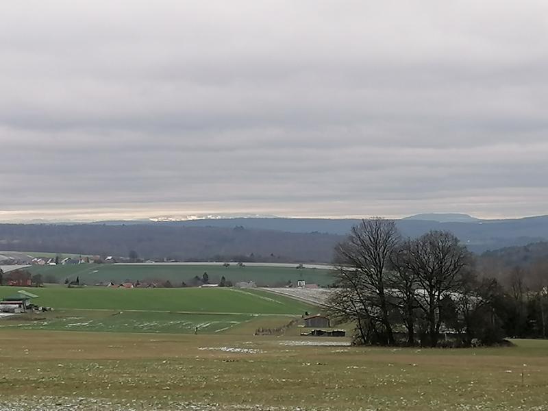 Im Hintergrund etwa 40 km östlich am Horizont ist Schnee zu sehen. Im fränkischen Weinland. Eigentlich tieferliegend und wärmer.
